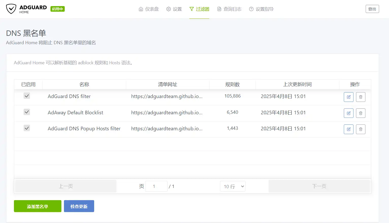 为了更好地发挥 AdGuard Home 去广告的功能,仅依靠默认的过滤规则是不够的,但也不宜过多,过多的过滤规则会影响解析的速度,可以根据需要添加过滤规则。