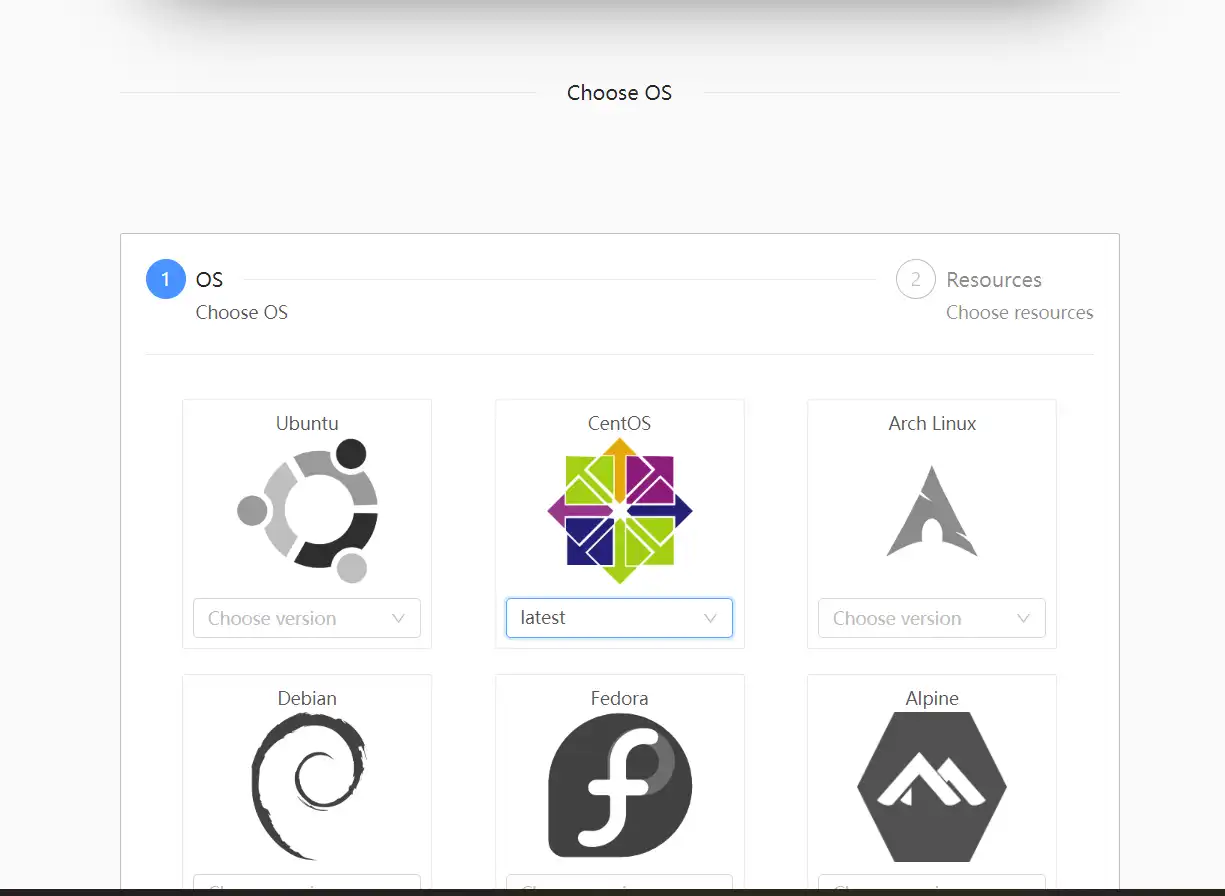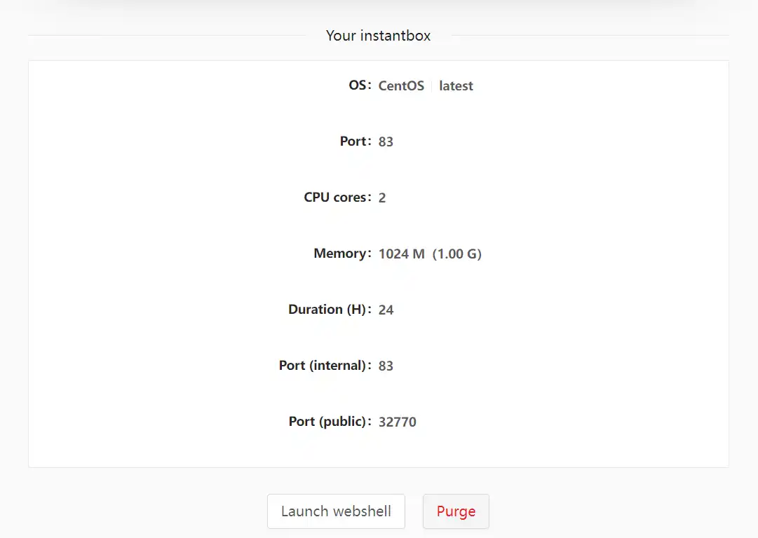 docker-compose up -d 从ip:82访问。选择一个常用的系统,点击 Next,设置好 CPU 核数,内存,端口等信息,点击 Create ,稍等 1 - 2 分钟后,直接打开 Web Shell。因为下载的 Linux 版本是对应发行版本的精简系统,除了重要内置工具自带了,其他工具需要用的时候进行安装。