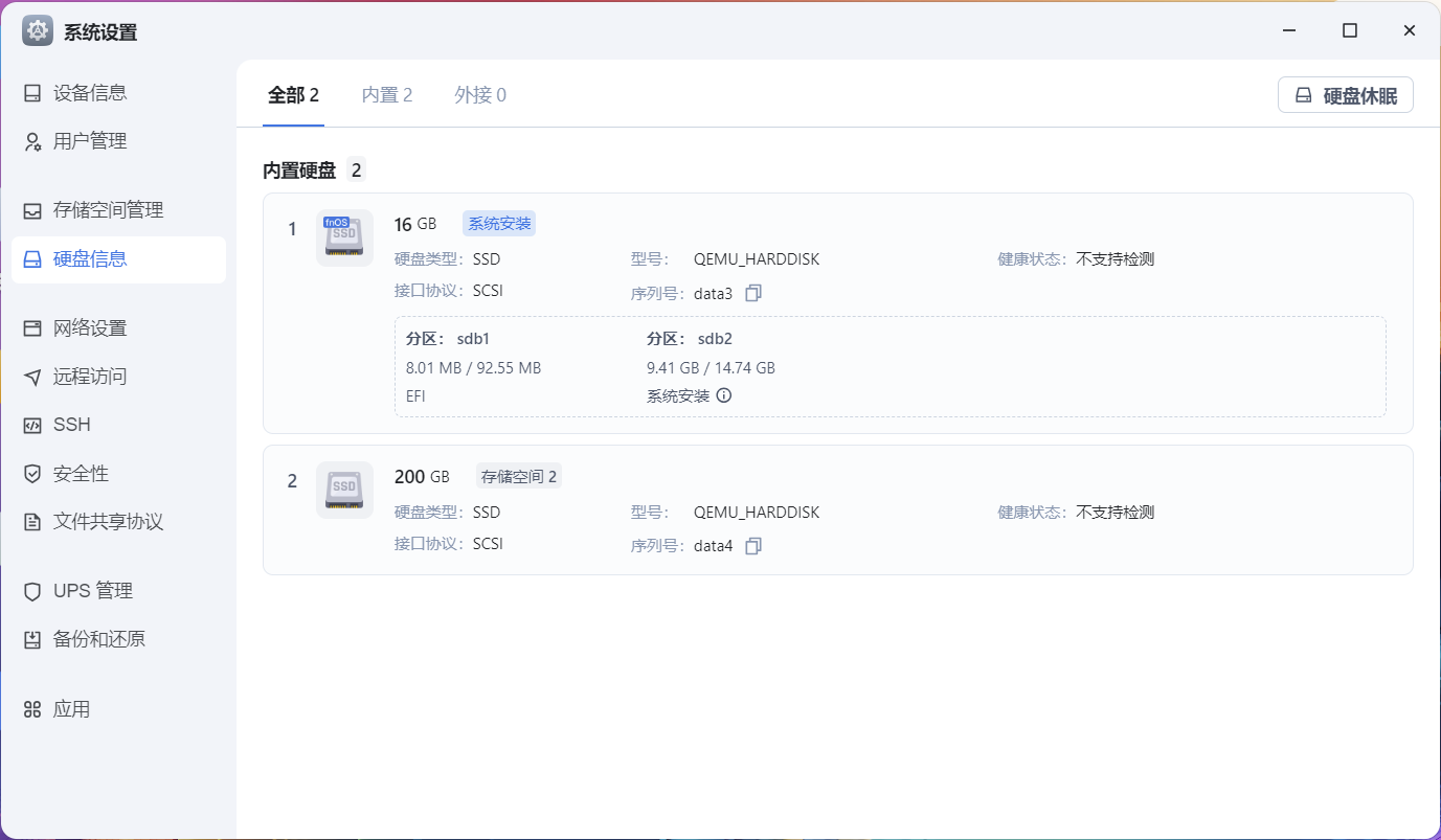 这里挂载的硬盘就是/storage和/storage2,分别是在挂载的目录下创建了data.img磁盘。第一个磁盘用来安装飞牛系统,后一个磁盘是数据盘。