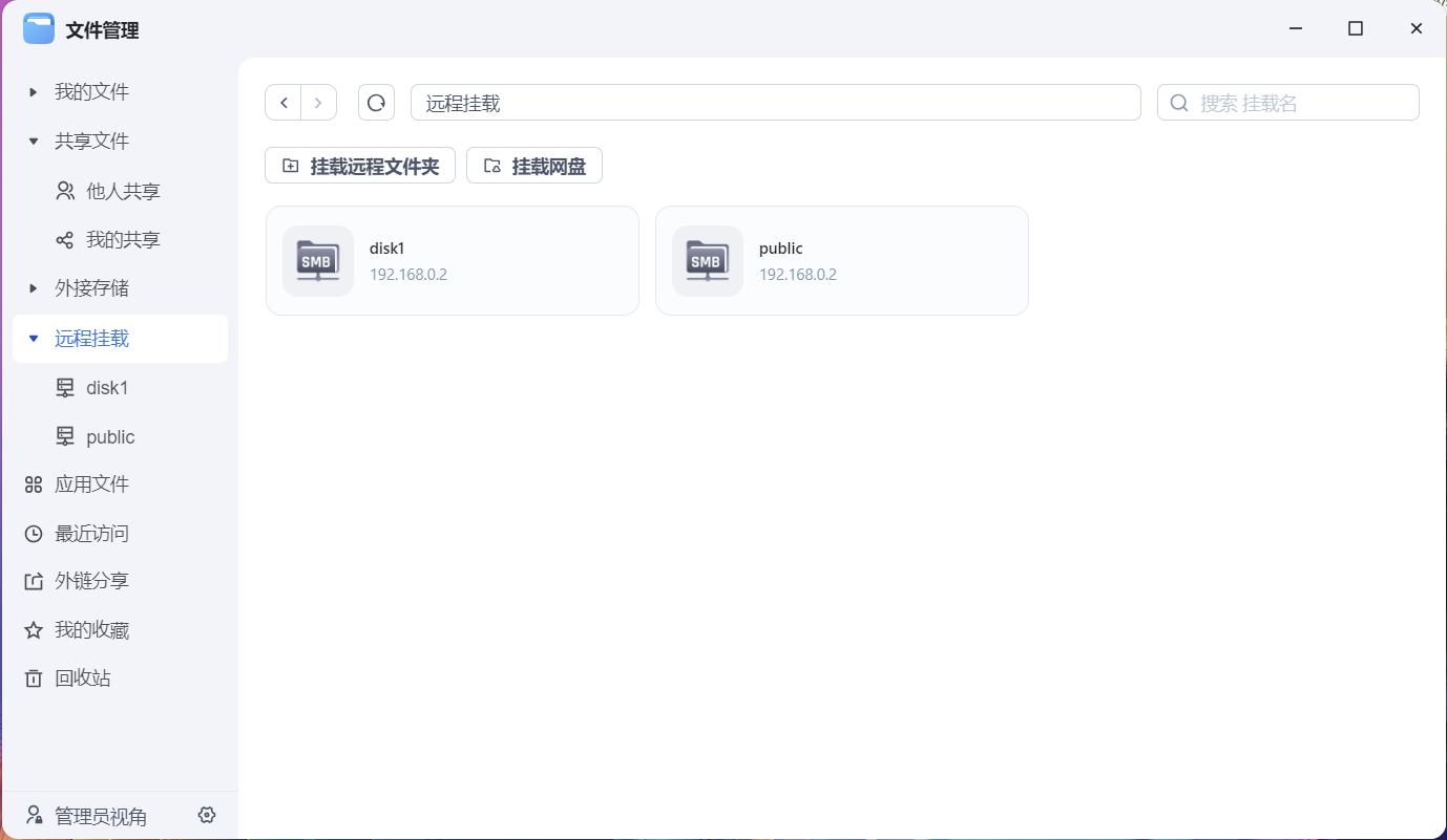 从文件管理应用里可以挂载远程目录,比如smb,网盘等。由于使用了macvlan网络,fnos无法访问docker主机,如果smb在主机上,可通过第三个主机上lucky的端口转发来访问docker主机上的smb文件。