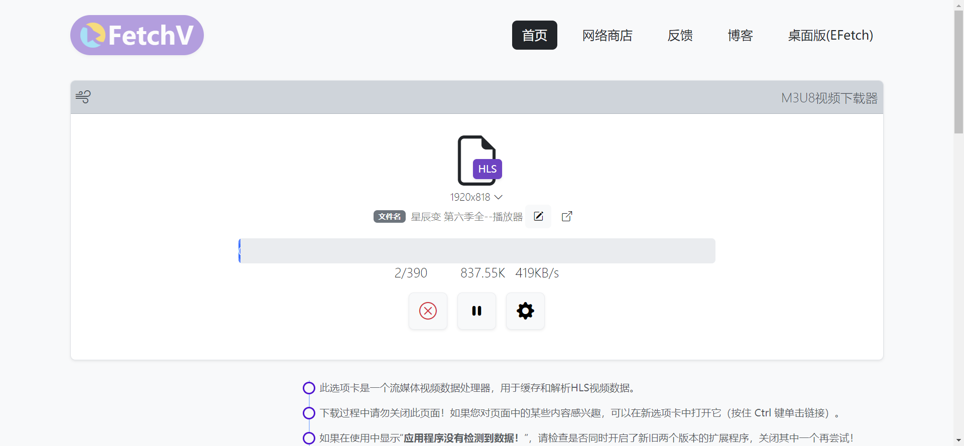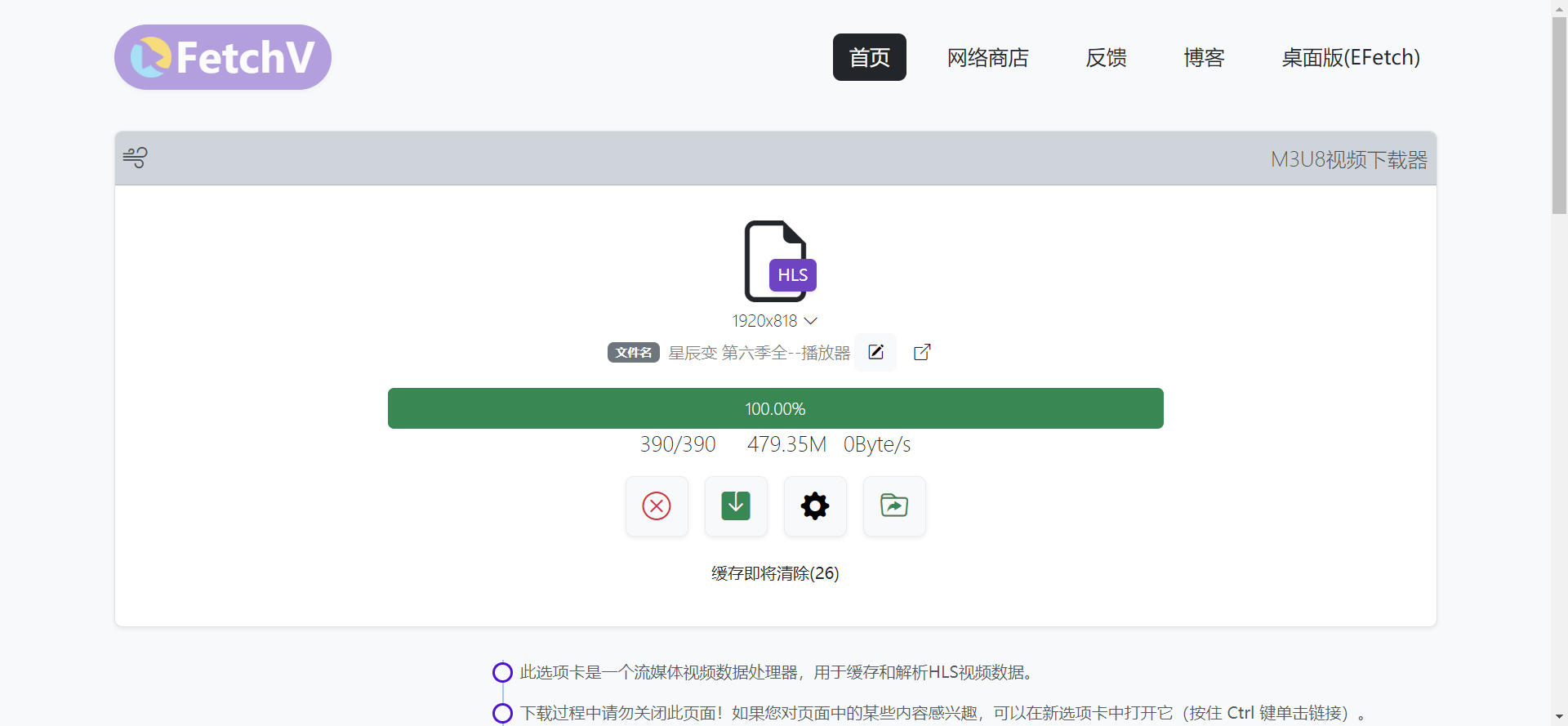 打开在线播放网页,工具栏上的fetchV上会显示数字,这是能下载的数目,点击图标,点击hls条目后面的“下载”打开下载页面,下载完成时,点击保存按钮。