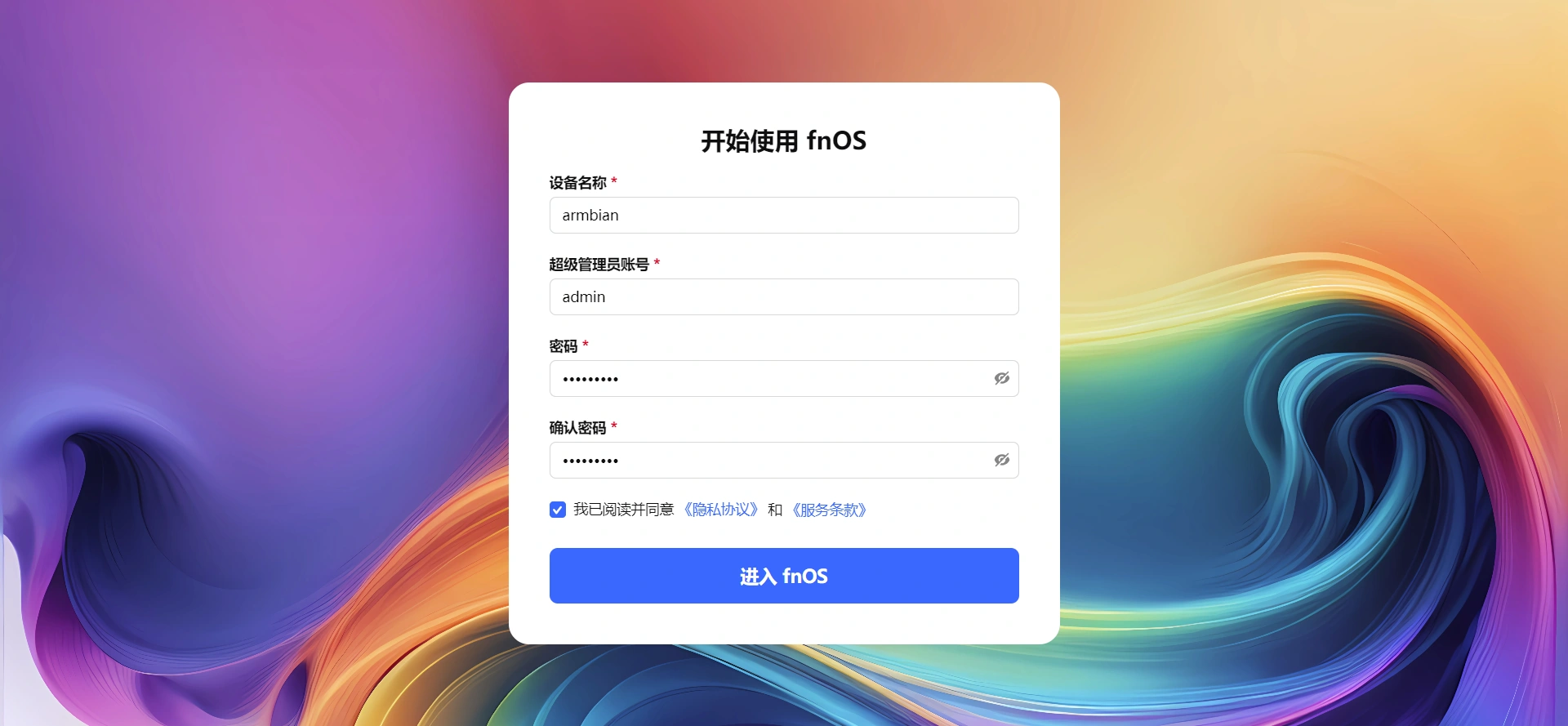 下载后解压成.img文件(很重要!),用 Rufus( 或者 balenaEtcher)写入U盘,把写好系统的 USB 插入盒子。启动完成后,到路由器后端查看新接入的名为armbian的设备的ip,通过浏览器打开ip:5666进入飞牛设置。由于不能写入emmc,后面安装到emmc的步骤就没用了。