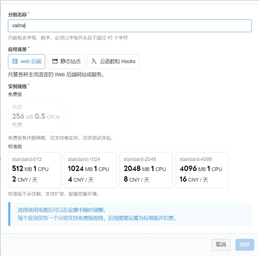 点击云引擎-管理部署-创建分组,分组名称“valine”,选中“免费版”,创建。