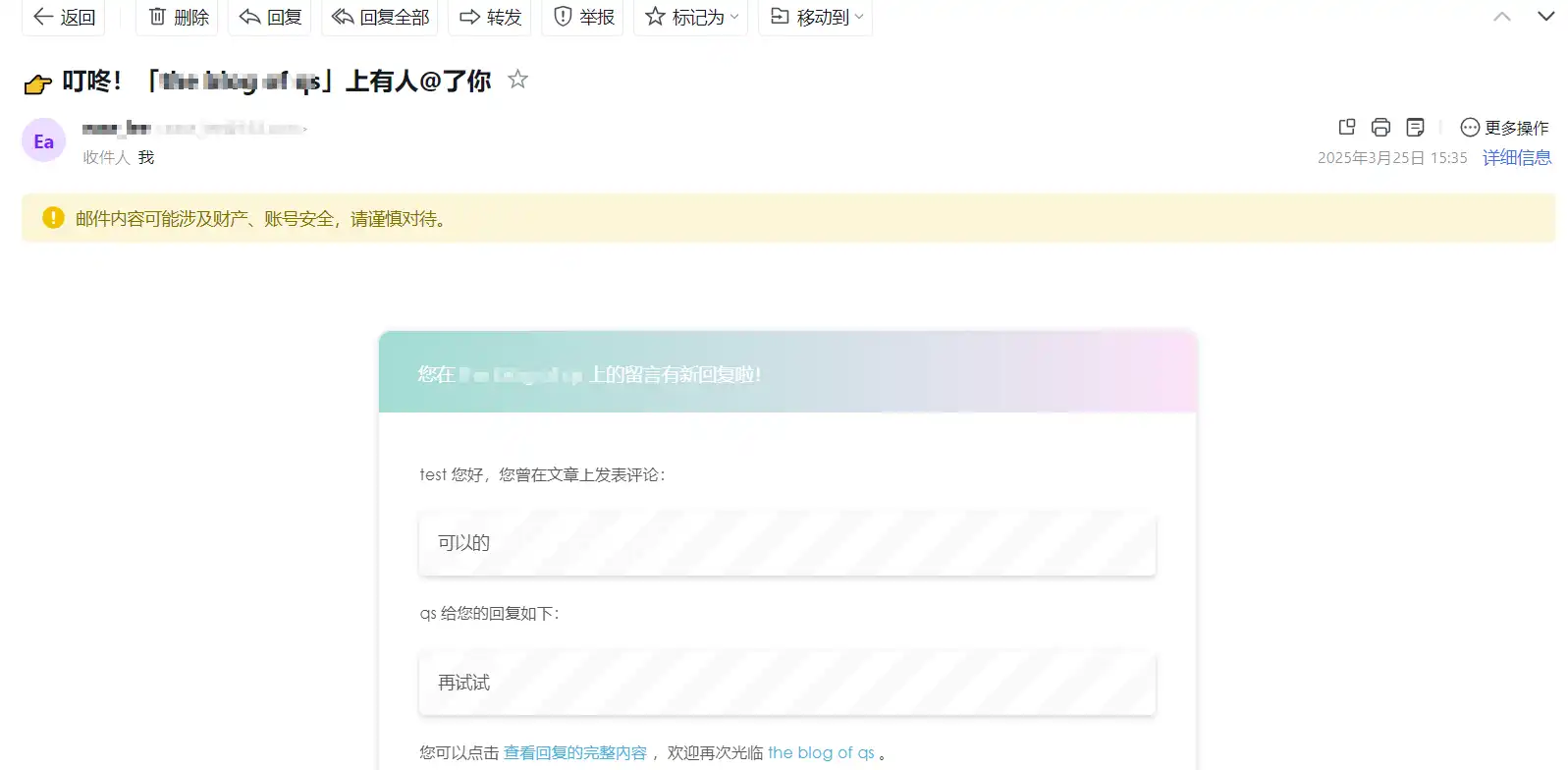 在Valine里留言并留下邮箱,再查看邮箱,果然有提醒。