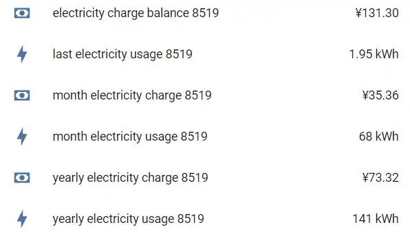 2025-03-31 16:36:23 [INFO ] ---- Homeassistant sensor sensor.month_electricity_charge_7787 state updated: 104.52 CNY 2025-03-31 16:36:23 [INFO ] ---- User xxxxxx3667787 state-refresh task run successfully! 2025-03-31 16:37:43 [INFO ] ---- Get electricity charge balance for 1601356178519 successfully, balance is 131.3 CNY. 2025-03-31 16:39:19 [INFO ] ---- Get year power usage for xxxxxx6178519 successfully, usage is 141 kwh 2025-03-31 16:39:19 [INFO ] ---- Get year power charge for xxxxxx6178519 successfully, yealrly charge is 73.32 CNY 2025-03-31 16:39:34 [INFO ] ---- Get month power charge for xxxxxx6178519 successfully, 2025-01-01-2025-01-31 usage is 73 KWh, charge is 37.96 CNY. 2025-03-31 16:39:34 [INFO ] ---- Get month power charge for xxxxxx6178519 successfully, 2025-02-01-2025-02-28 usage is 68 KWh, charge is 35.36 CNY. 2025-03-31 16:39:49 [INFO ] ---- Get daily power consumption for 1601356178519 successfully, , 2025-03-30 usage is 1.95 kwh. 2025-03-31 16:39:49 [INFO ] ---- enable_database_storage is true, we will store the data to the database. 2025-03-31 16:40:20 [INFO ] ---- Database of /data/homeassistant.db created successfully. 2025-03-31 16:40:20 [INFO ] ---- Table dailyxxxxxx6178519 created successfully 2025-03-31 16:40:20 [INFO ] ---- Table dataxxxxxx6178519 created successfully 2025-03-31 16:40:20 [INFO ] ---- The electricity consumption of 1.95KWh on 2025-03-30 has been successfully deposited into the database 2025-03-31 16:40:20 [INFO ] ---- The electricity consumption of 2.45KWh on 2025-03-29 has been successfully deposited into the database 2025-03-31 16:40:20 [INFO ] ---- The electricity consumption of 2.77KWh on 2025-03-28 has been successfully deposited into the database 2025-03-31 16:40:20 [INFO ] ---- The electricity consumption of 1.76KWh on 2025-03-27 has been successfully deposited into the database 2025-03-31 16:40:20 [INFO ] ---- The electricity consumption of 2.52KWh on 2025-03-26 has been successfully deposited into the database 2025-03-31 16:40:20 [INFO ] ---- The electricity consumption of 2.1KWh on 2025-03-25 has been successfully deposited into the database 2025-03-31 16:40:20 [INFO ] ---- The electricity consumption of 2.74KWh on 2025-03-24 has been successfully deposited into the database 2025-03-31 16:40:20 [INFO ] ---- Check the electricity bill balance, the notification will be sent = False