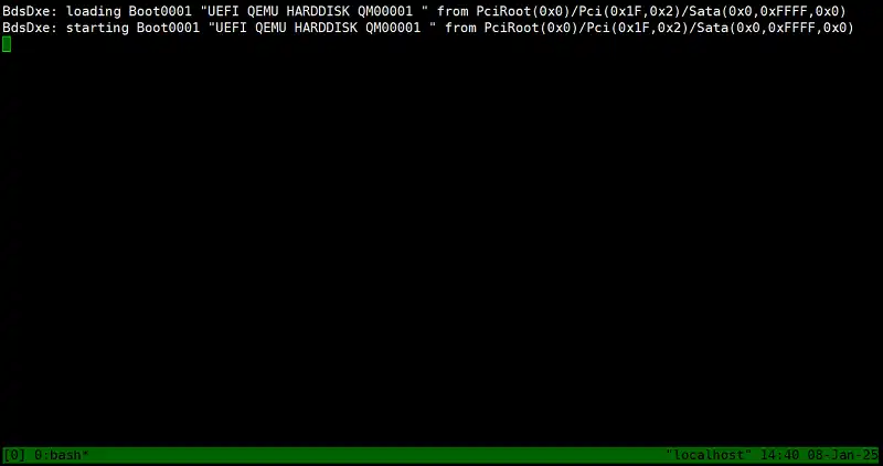 会打开一个终端一样的窗口,在里面运行启动qemu的脚本,按ctrl+b,d退出,qemu会在后台继续运行,而不会直接退出。