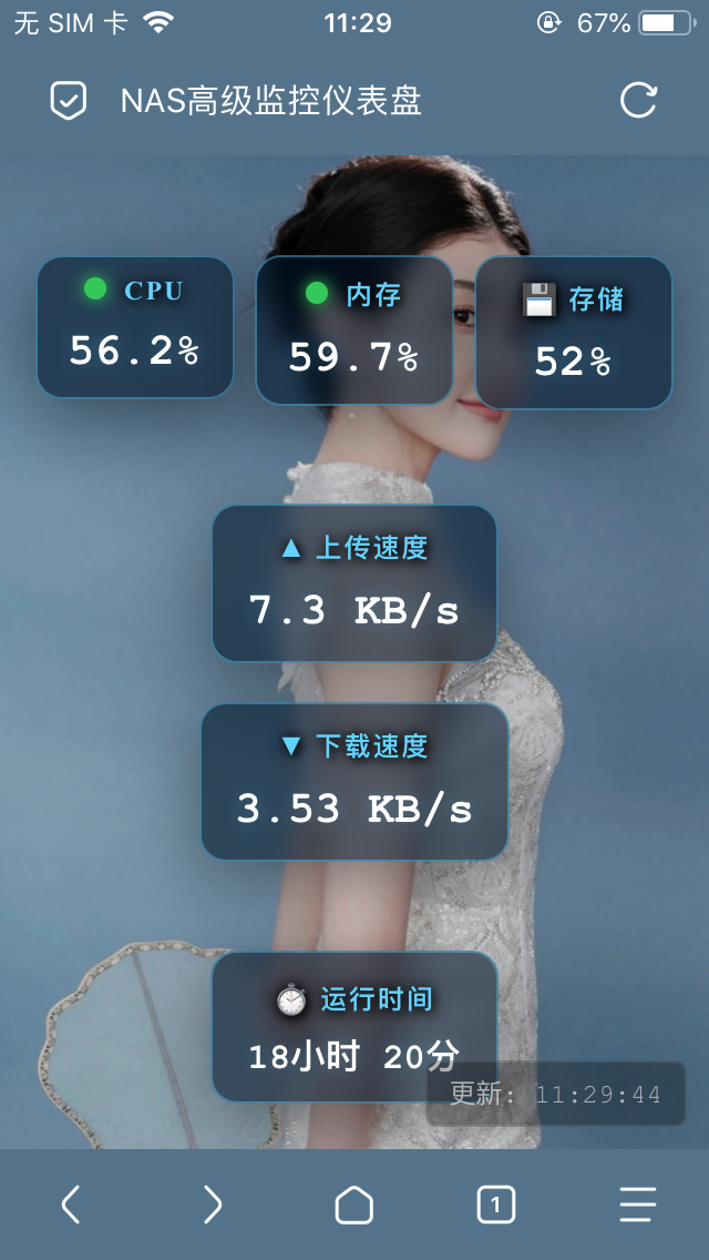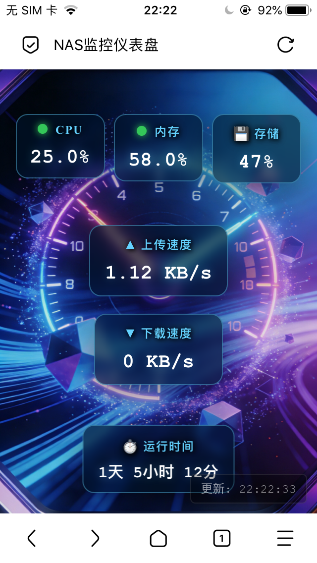 window.addEventListener('load', function() { console.log('NAS监控仪表盘初始化...'); updateLastUpdateTime(); fetchData(); initRefreshTimer(); var bgImg = document.getElementById('bg-image'); if (bgImg.complete) { console.log('背景图片已加载'); } else { bgImg.onload = function() { console.log('背景图片加载完成'); }; bgImg.onerror = function() { console.log('背景图片加载失败'); }; } document.addEventListener('touchstart', function() {}, {passive: true}); });