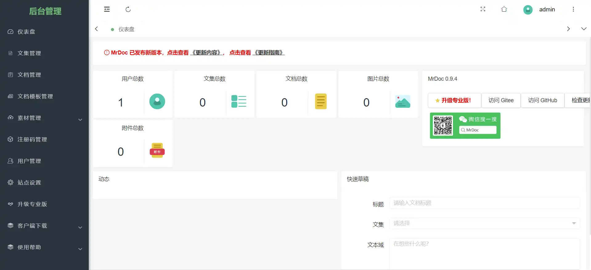 默认密码:执行 docker logs mrdoc 2>&1|grep pwd 获取
