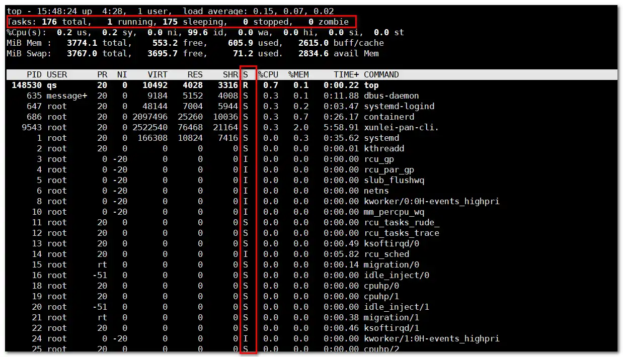 1 2 3 4 5 6 7 qs@ubuntu:~$top top - 15 :46:57 up 4 :27, 1 user, load average: 0.02 , 0.02 , 0.00 Tasks: 176 total, 1 running, 175 sleeping, 0 stopped, 0 zombie %Cpu(s): 0.2 us, 0.1 sy, 0.0 ni, 99.7 id, 0.0 wa, 0.0 hi, 0.0 si, 0.0 st MiB Mem : 3774.1 total, 548.7 free, 610.6 used, 2614.7 buff/cache MiB Swap: 3767.0 total, 3695.7 free, 71.2 used. 2829.9 avail Mem ...