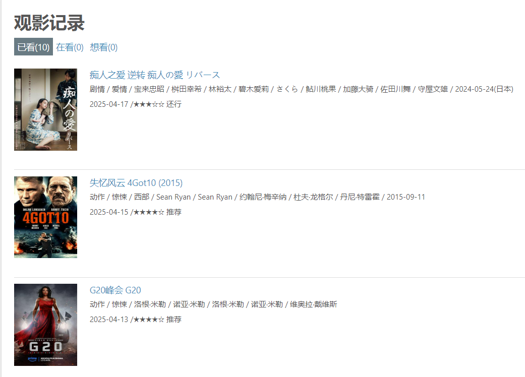 豆瓣的书影音档案比较有意思,在hexo插件里发现了一个工具可以很方便的获取并生成网页。