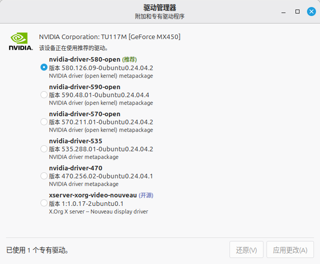 linux为mint22.3。有独立显卡nvidia,需要安装官方闭源驱动。